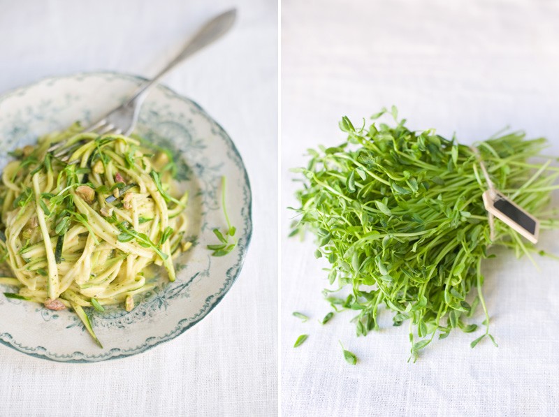 Mete a la licuadora el mango, con las hojas de menta, el chile, jenjibre y aceite de oliva. Cuando tengas la salsa, viértelo sobre las calabacitas. Condimenta con sal y pimienta. Decora con el germinado y los pistaches. (yo no siempre tengo pistaches y de repente lo he cambiado por nueces, nueces de la india, las almendras no le quedan tan bien pero puedes intentarlo!)
